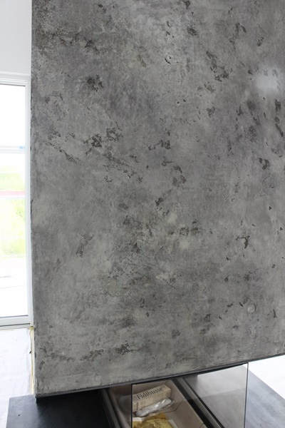 .....auf vorgeputzten Wänden in denen ein Ofen integriert ist, sollte eine Betonimitation entstehen. Auf der einen Seite raumhoch, öffnet sich die andere Seite bis ins obere Geschoss.