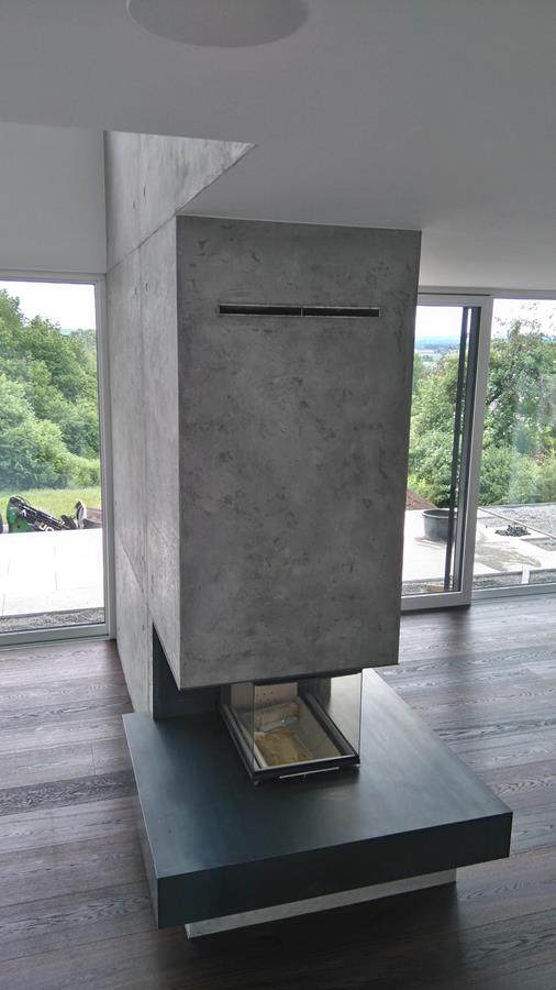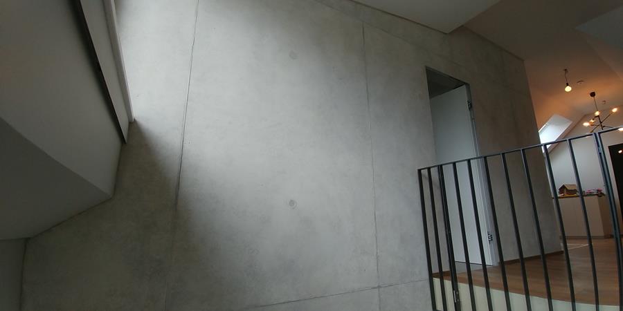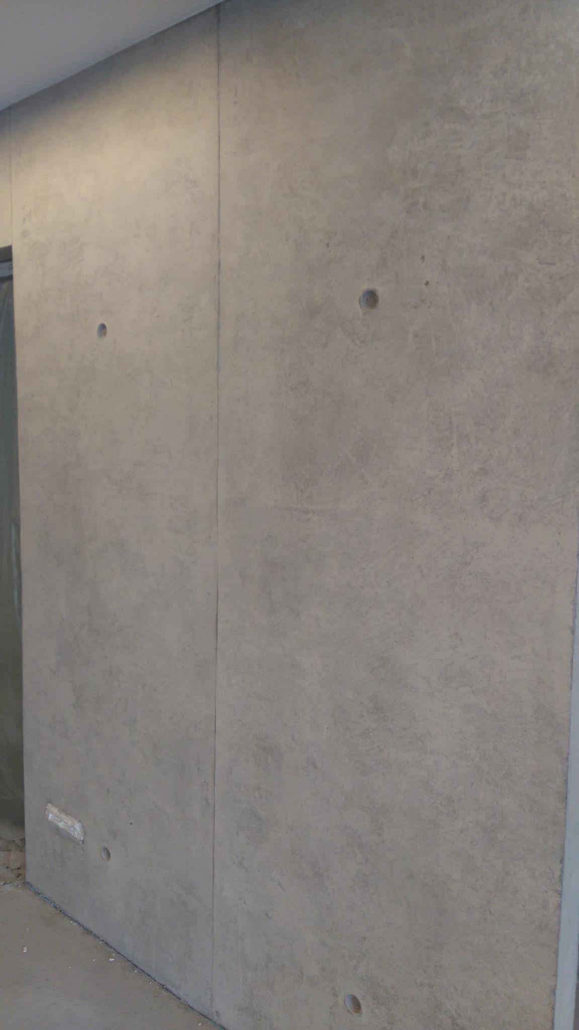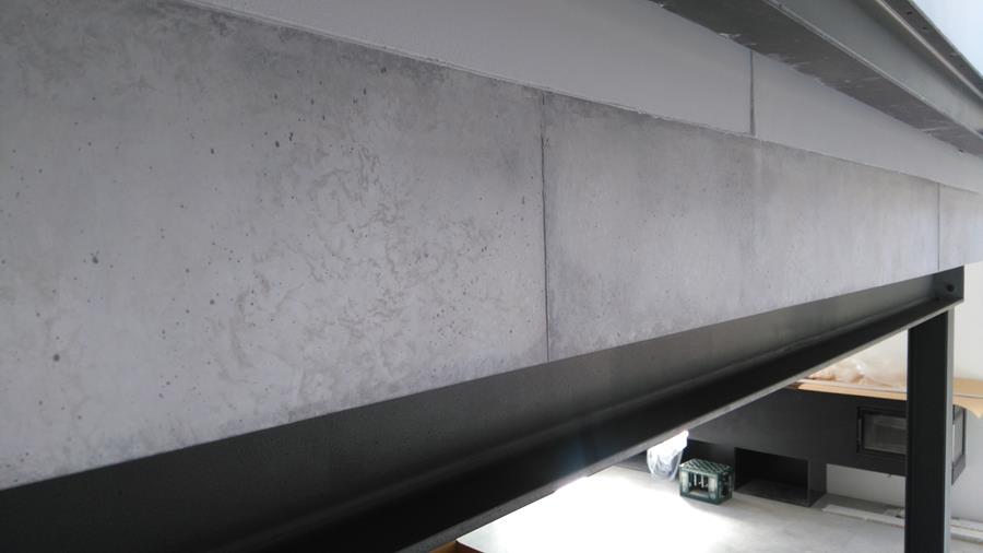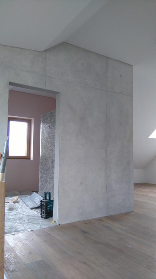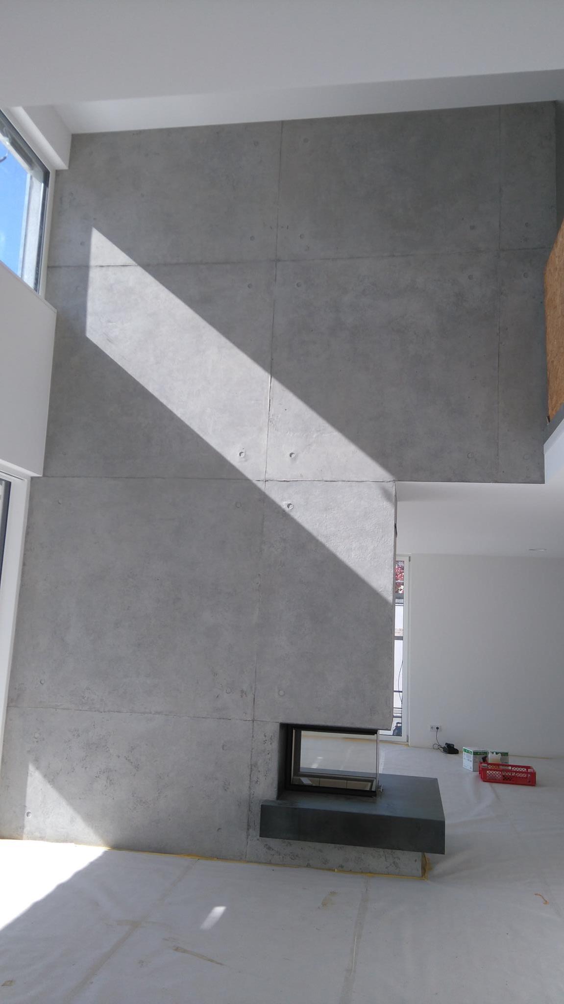 .....auf vorgeputzten Wänden in denen ein Ofen integriert ist, sollte eine Betonimitation entstehen. Auf der einen Seite raumhoch, öffnet sich die andere Seite bis ins obere Geschoss.
