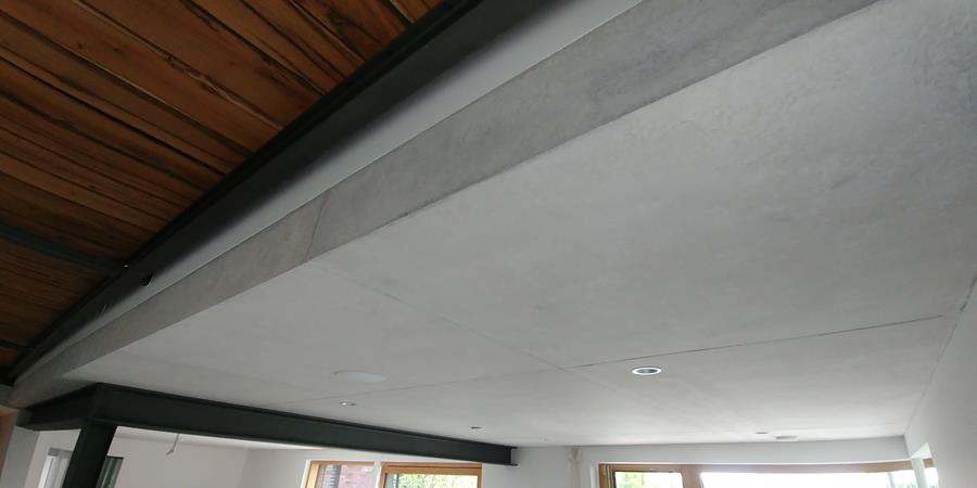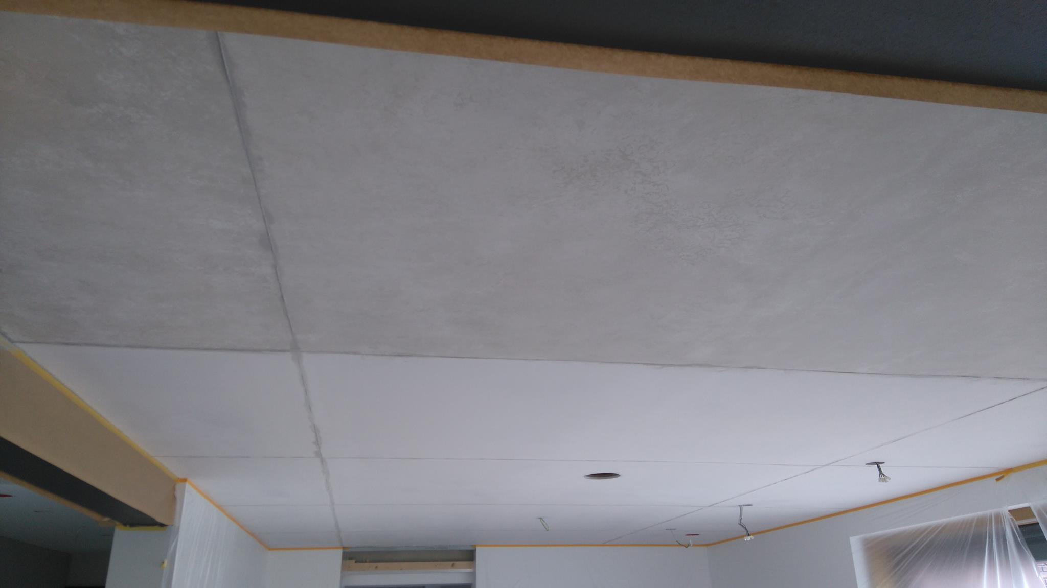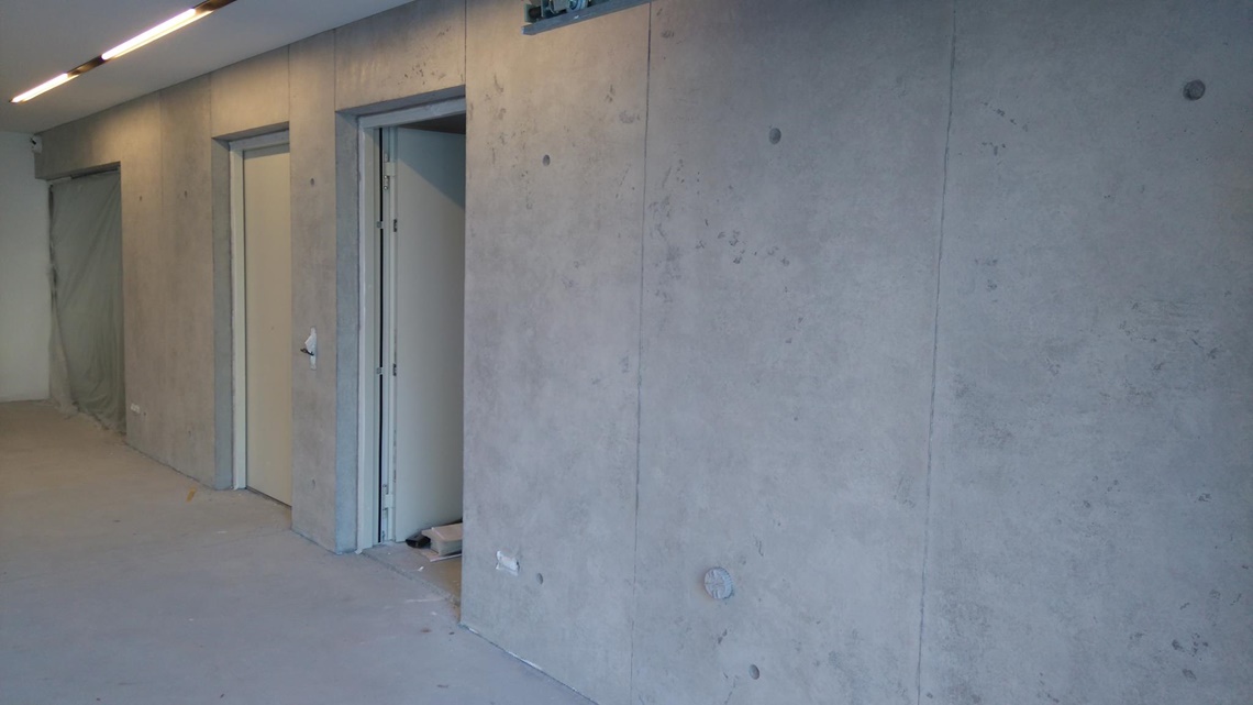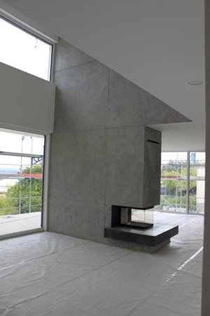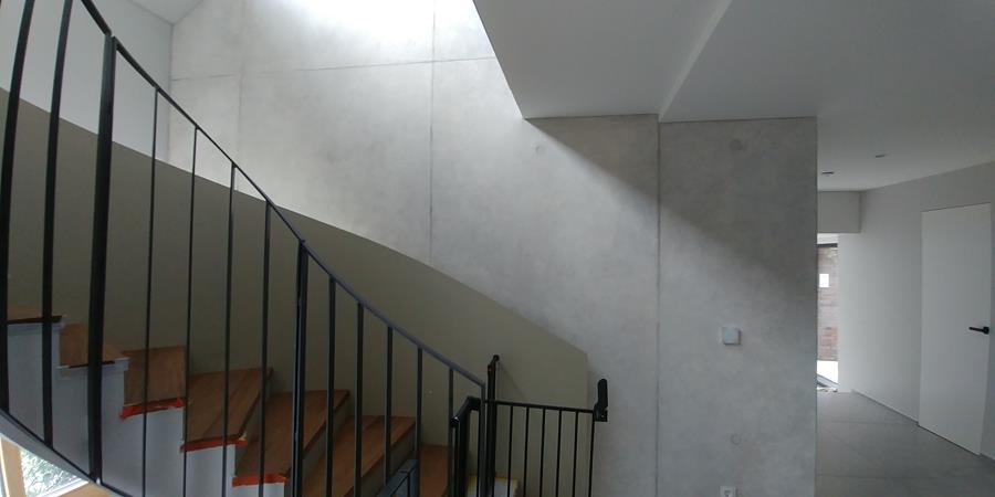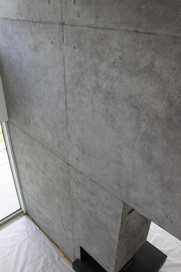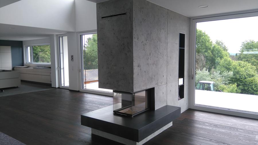 .....auf vorgeputzten Wänden in denen ein Ofen integriert ist, sollte eine Betonimitation entstehen. Auf der einen Seite raumhoch, öffnet sich die andere Seite bis ins obere Geschoss.
