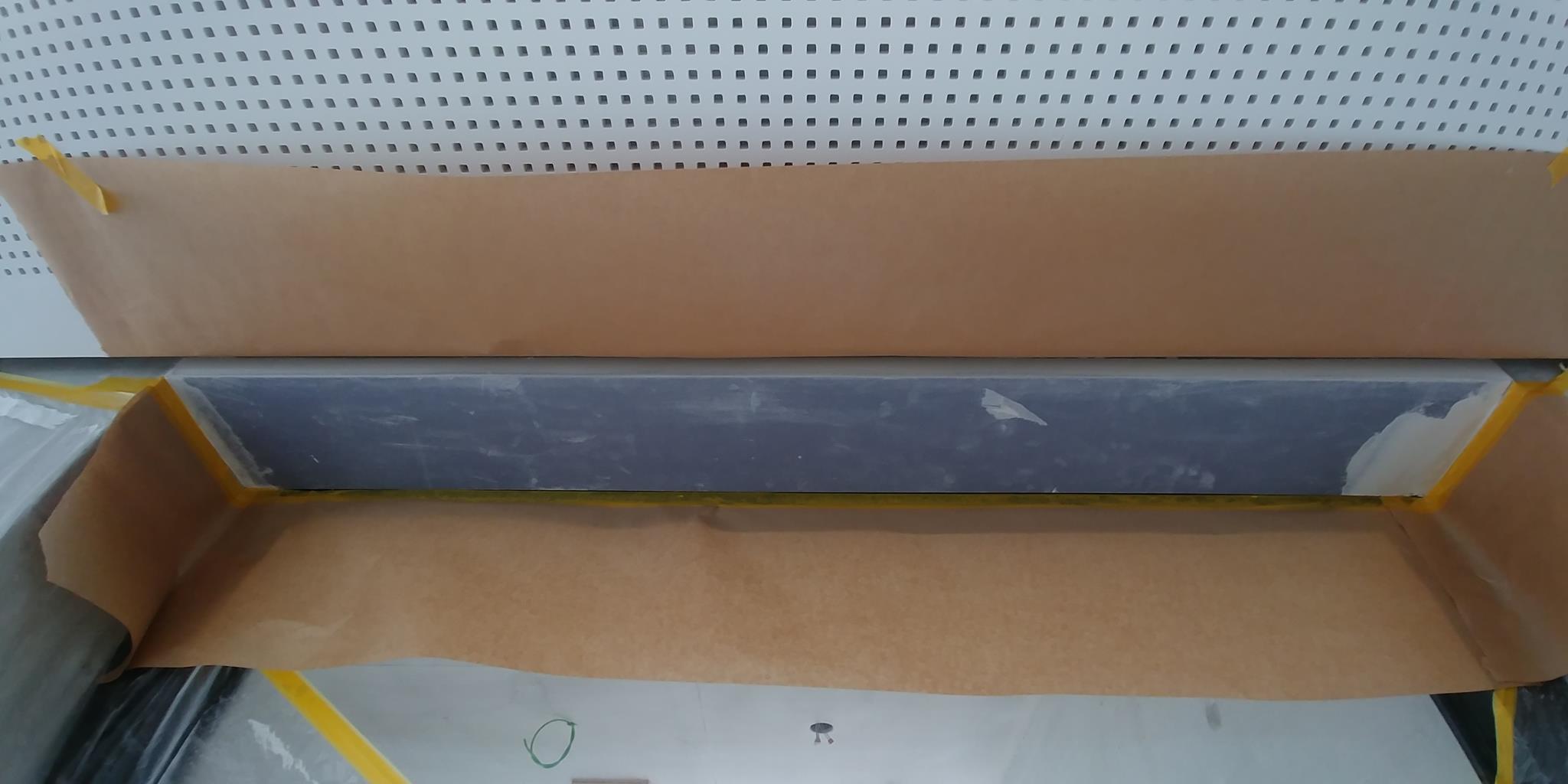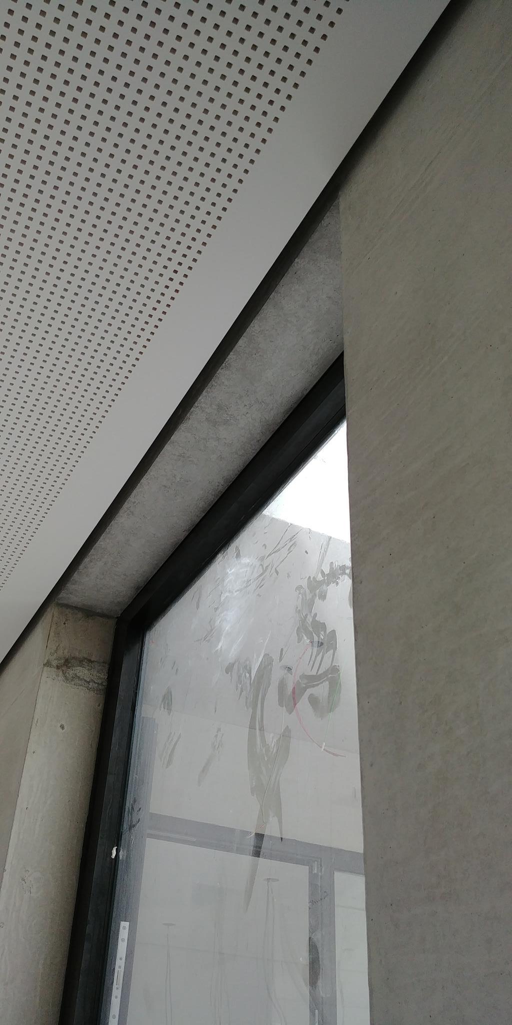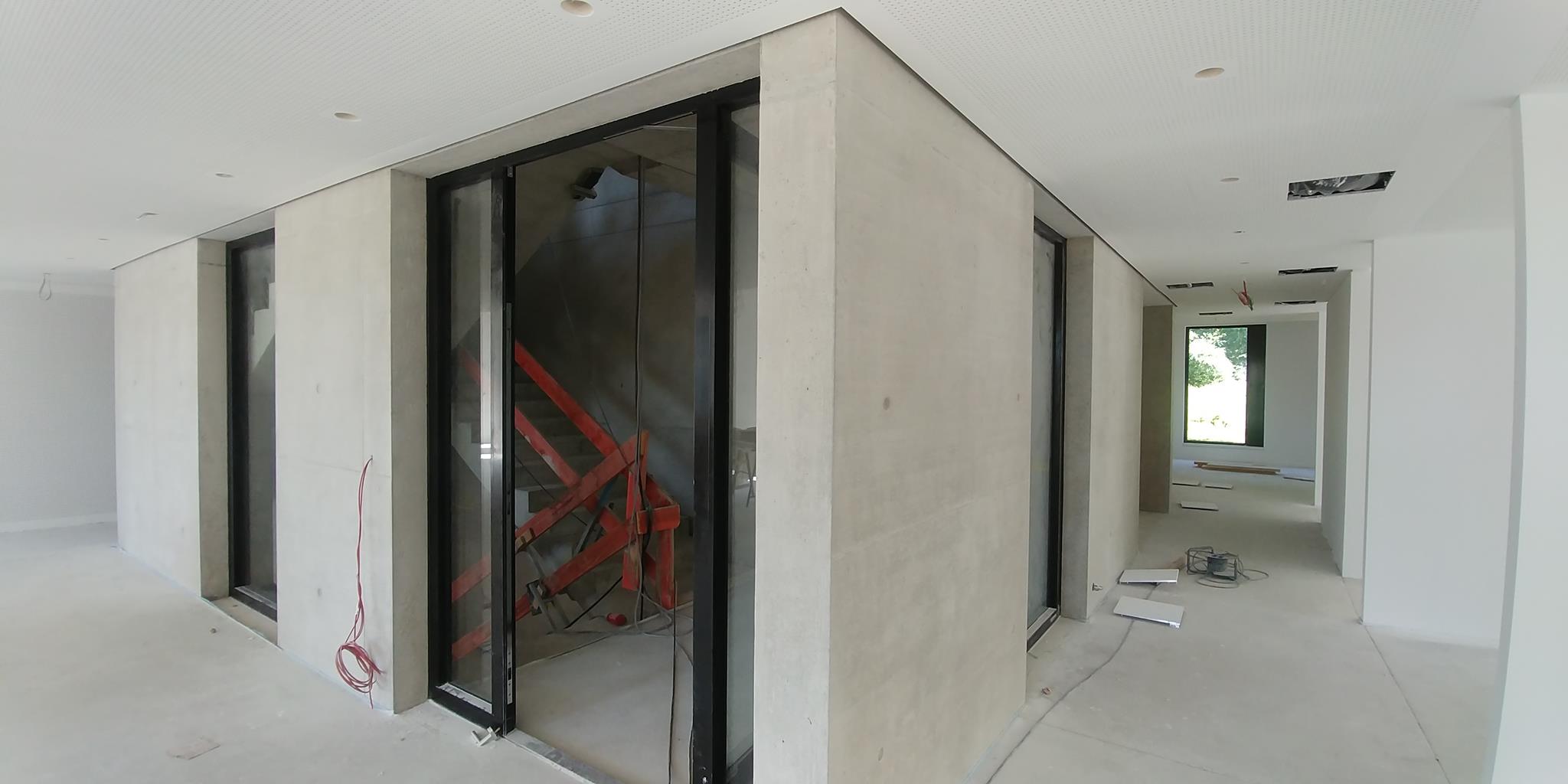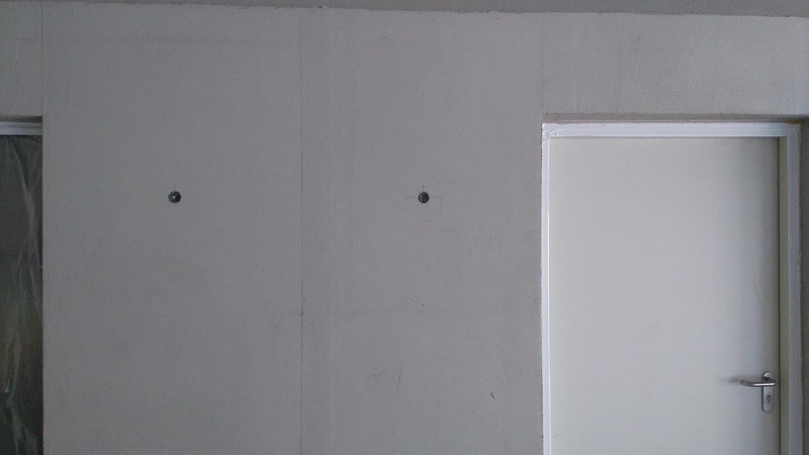 .....auf vorgeputzten Wänden in denen ein Ofen integriert ist, sollte eine Betonimitation entstehen. Auf der einen Seite raumhoch, öffnet sich die andere Seite bis ins obere Geschoss.