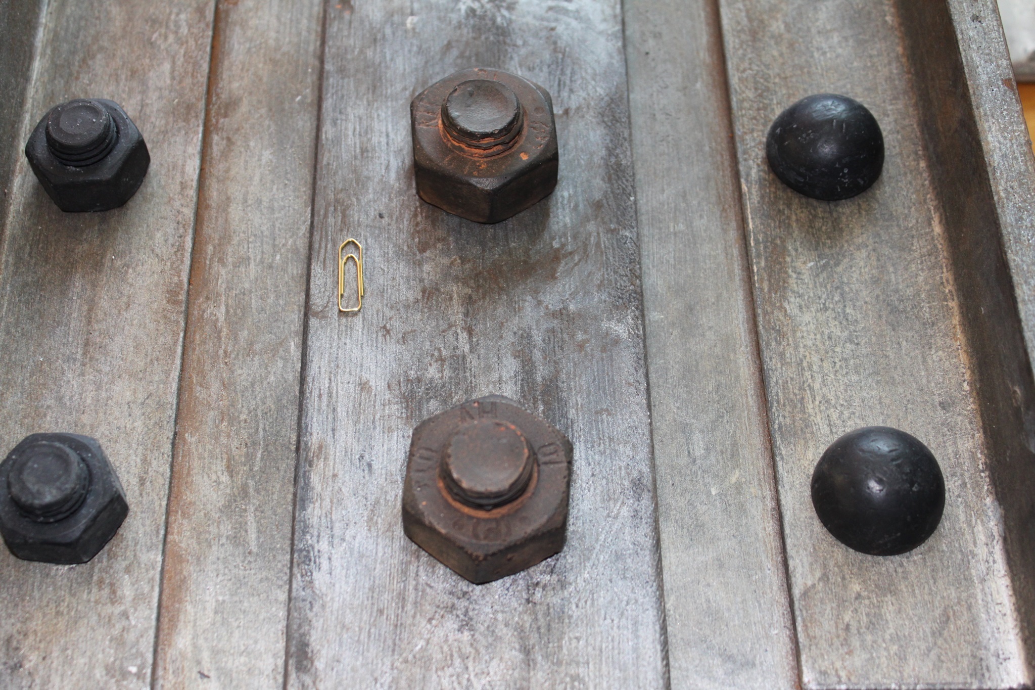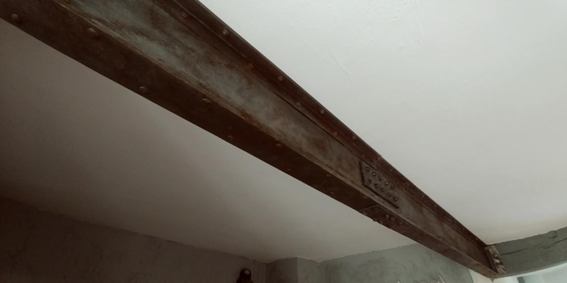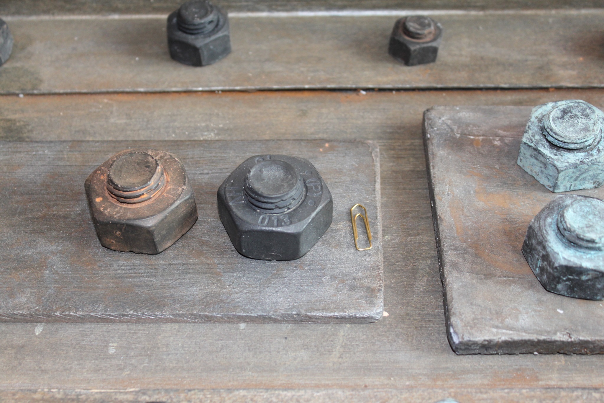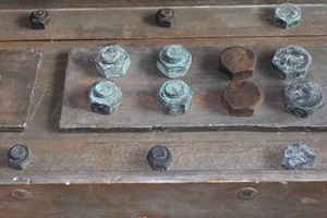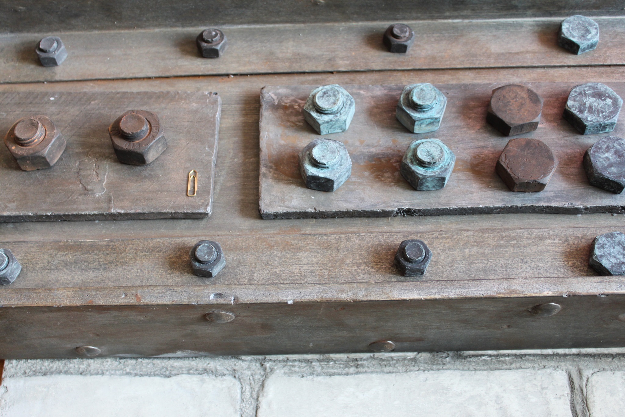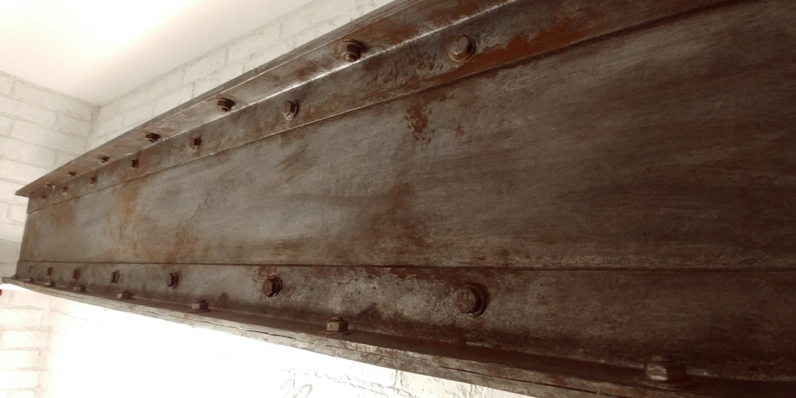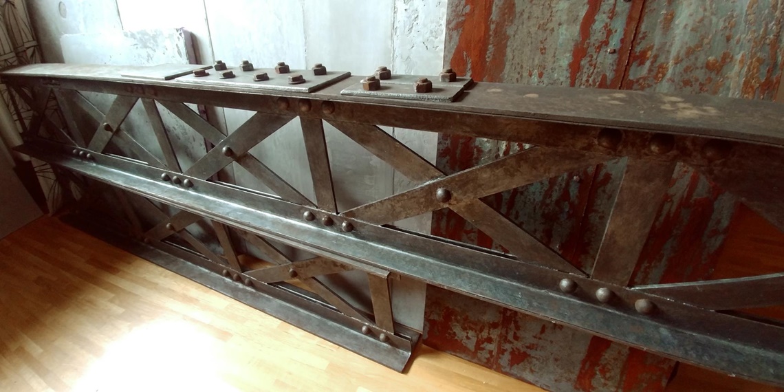 Die Eisenträgerimitationen bestehen zum Teil aus Pappe, Holzleisten, MDF und Bauplatten, die mit Echtrostlasur behandelt und Polymergips-Schrauben ergänzt werden.