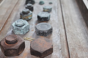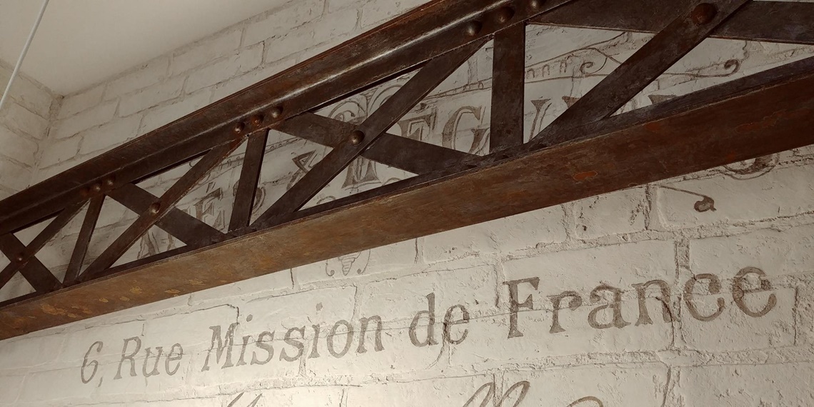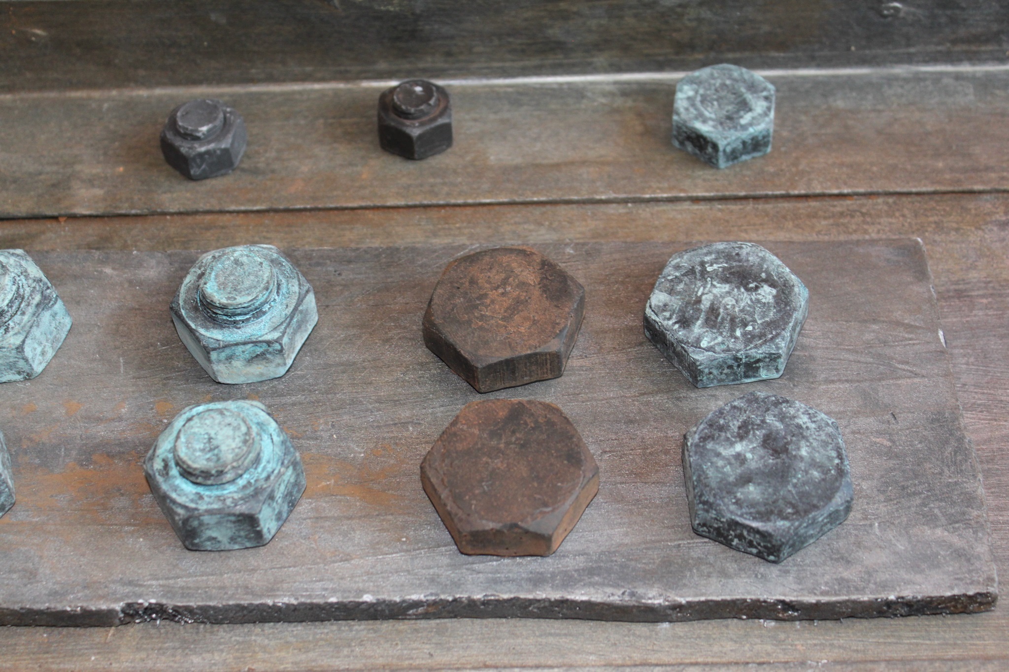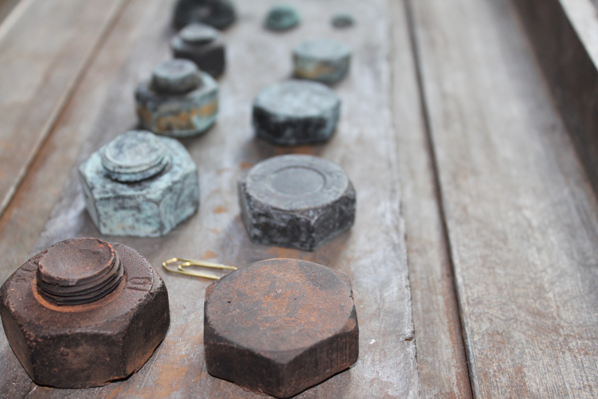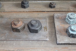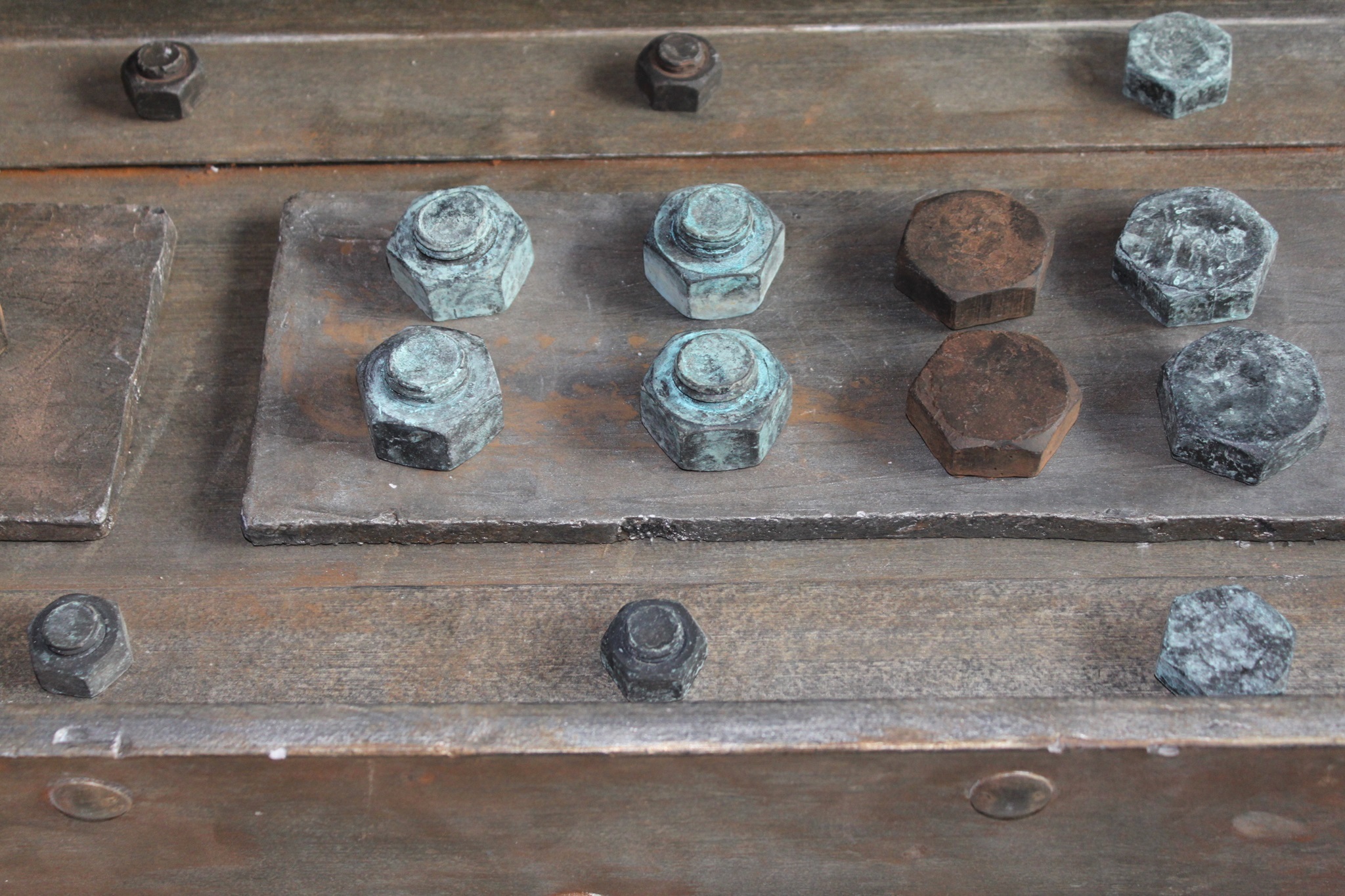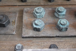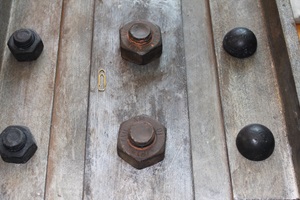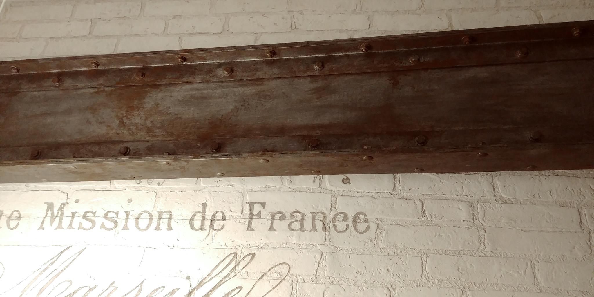 Die Eisenträgerimitationen bestehen zum Teil aus Pappe, Holzleisten, MDF und Bauplatten, die mit Echtrostlasur behandelt und Polymergips-Schrauben ergänzt werden.